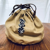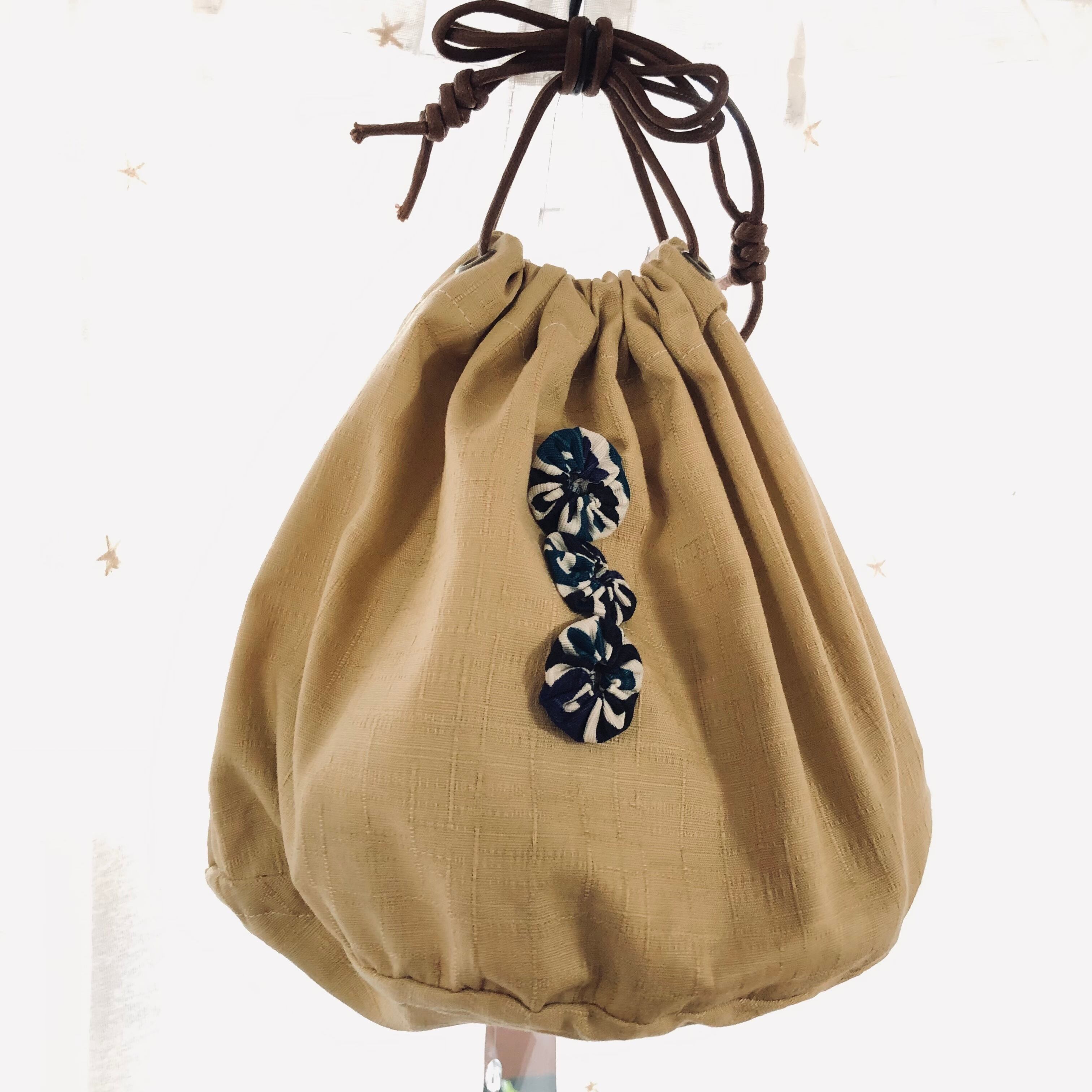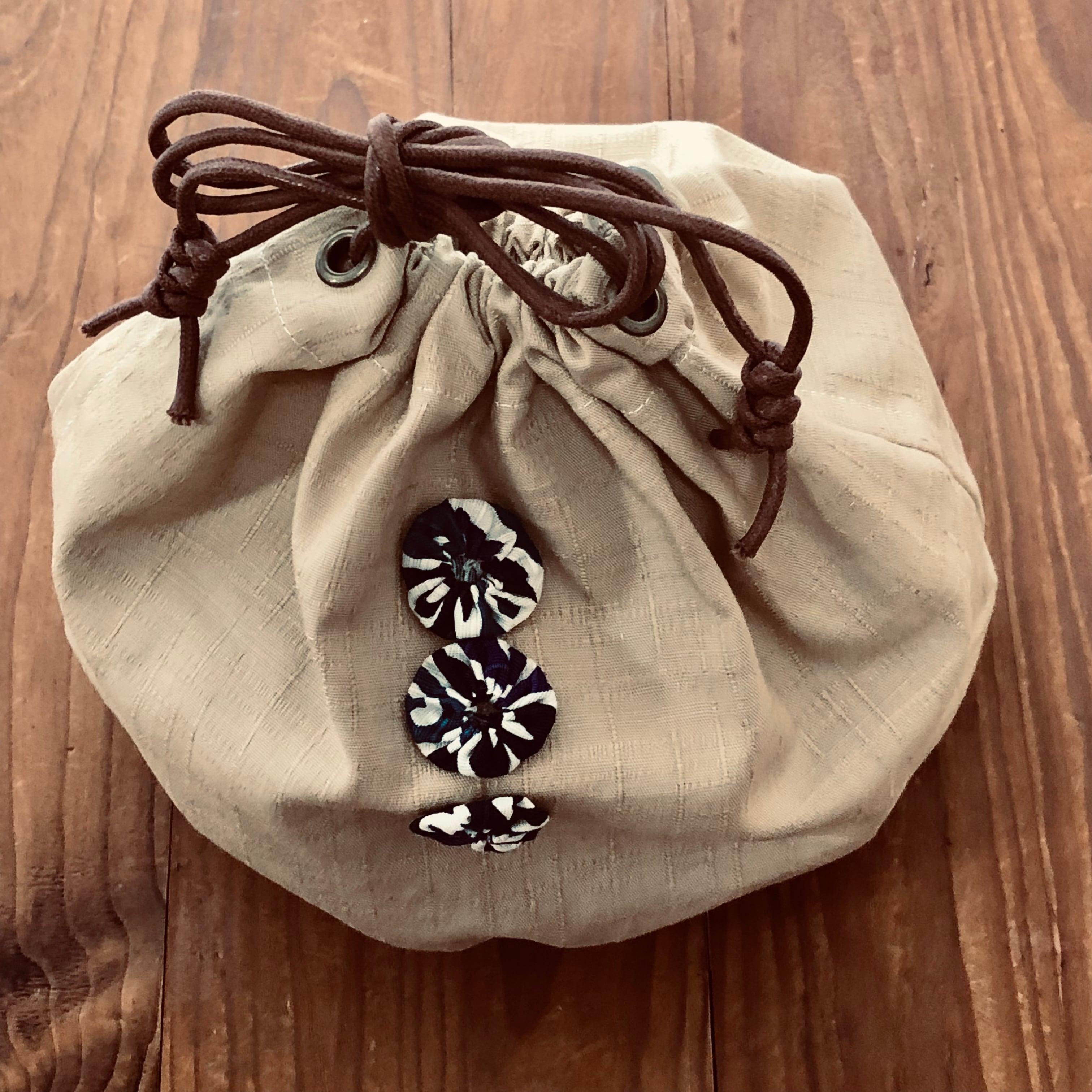 唐草模様の生地をヨーヨーキルトに仕立ててアクセントにしました。