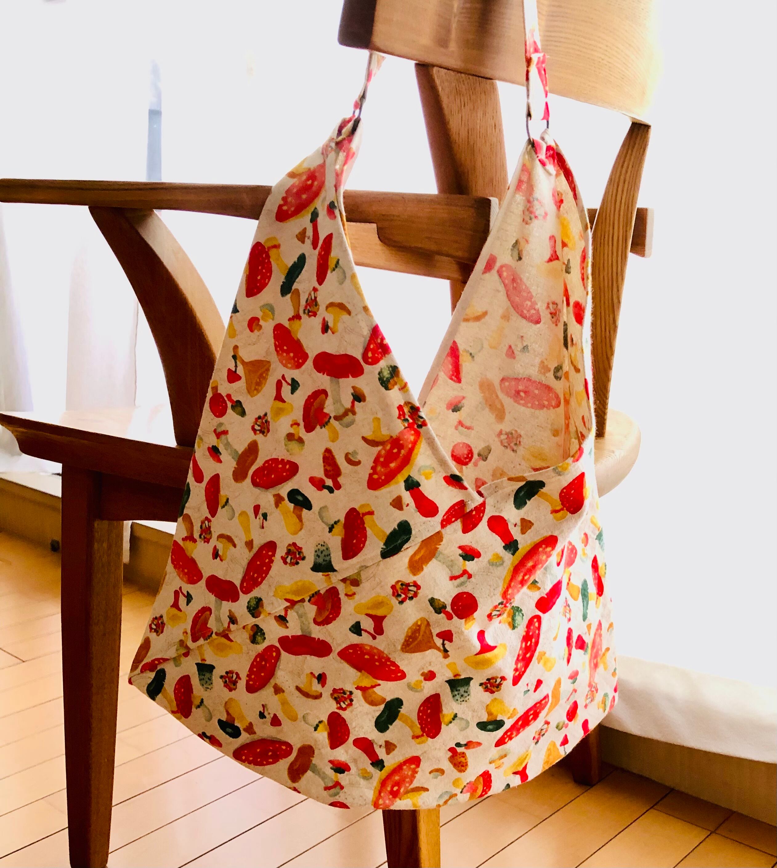 ナチュラル カラーのベースに色鮮やかなキノコたちがかわいい バッグ になりました。