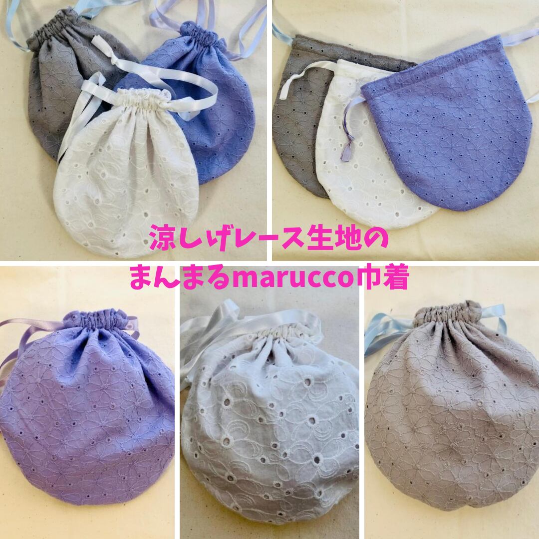 涼し気なレース生地を使用したmarucco巾着が登場しました。まんまるな形と、可愛いリボンがアクセントになって、ワンランク上のファッションアイテムになっています。小さなお財布や携帯電話、化粧ポーチなど、いろいろなアイテムを入れることができ、普段使いはもちろん、旅行やデートなどのお出かけスタイルにもぴったりです。